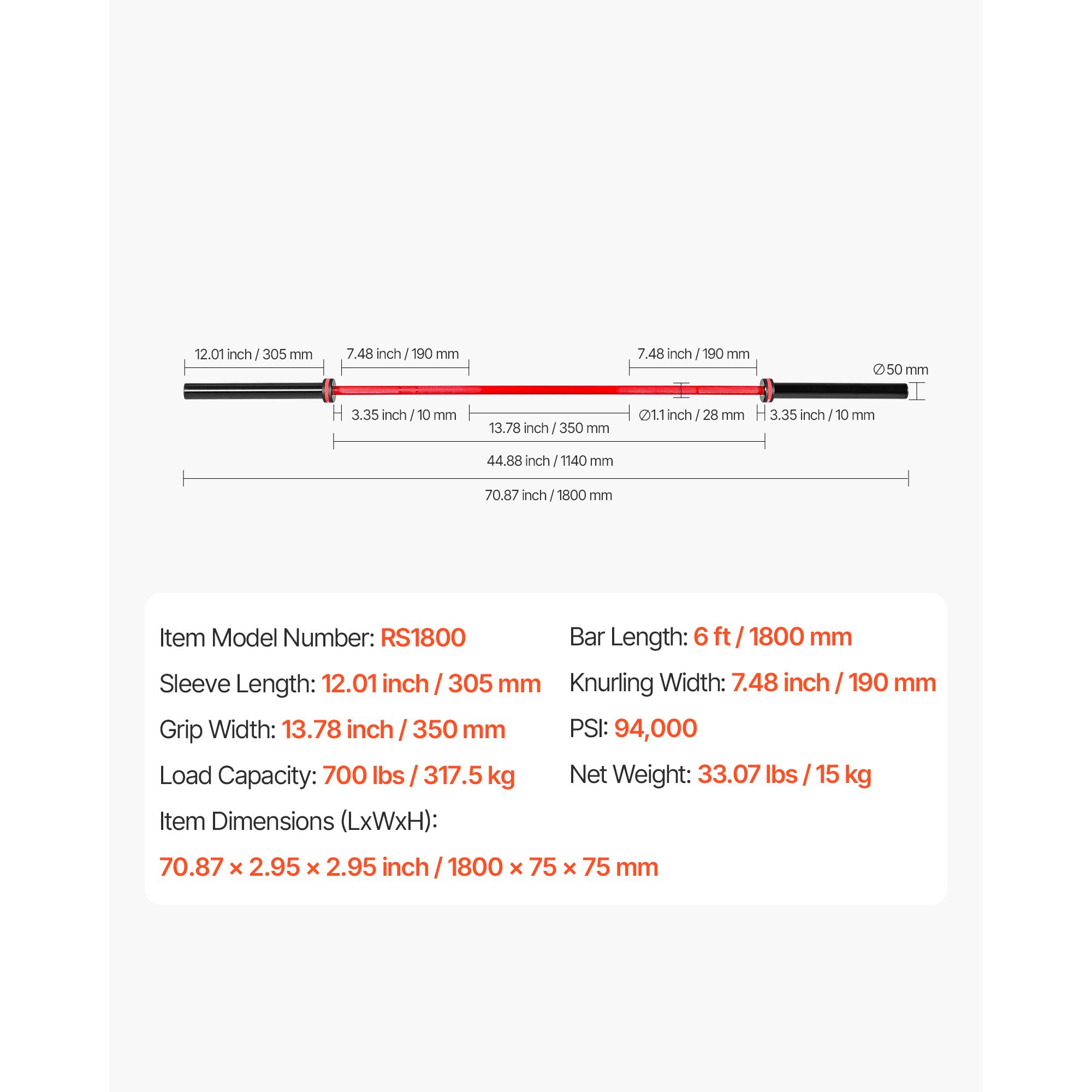 This bench press bar supports up to 700 lbs / 317.51 kg with a tensile strength of 94,000 PSI. Featuring brass bushings, needle bearings, and diamond knurling, it ensures stability, secure grip, and comfortable handling for effective strength training.
