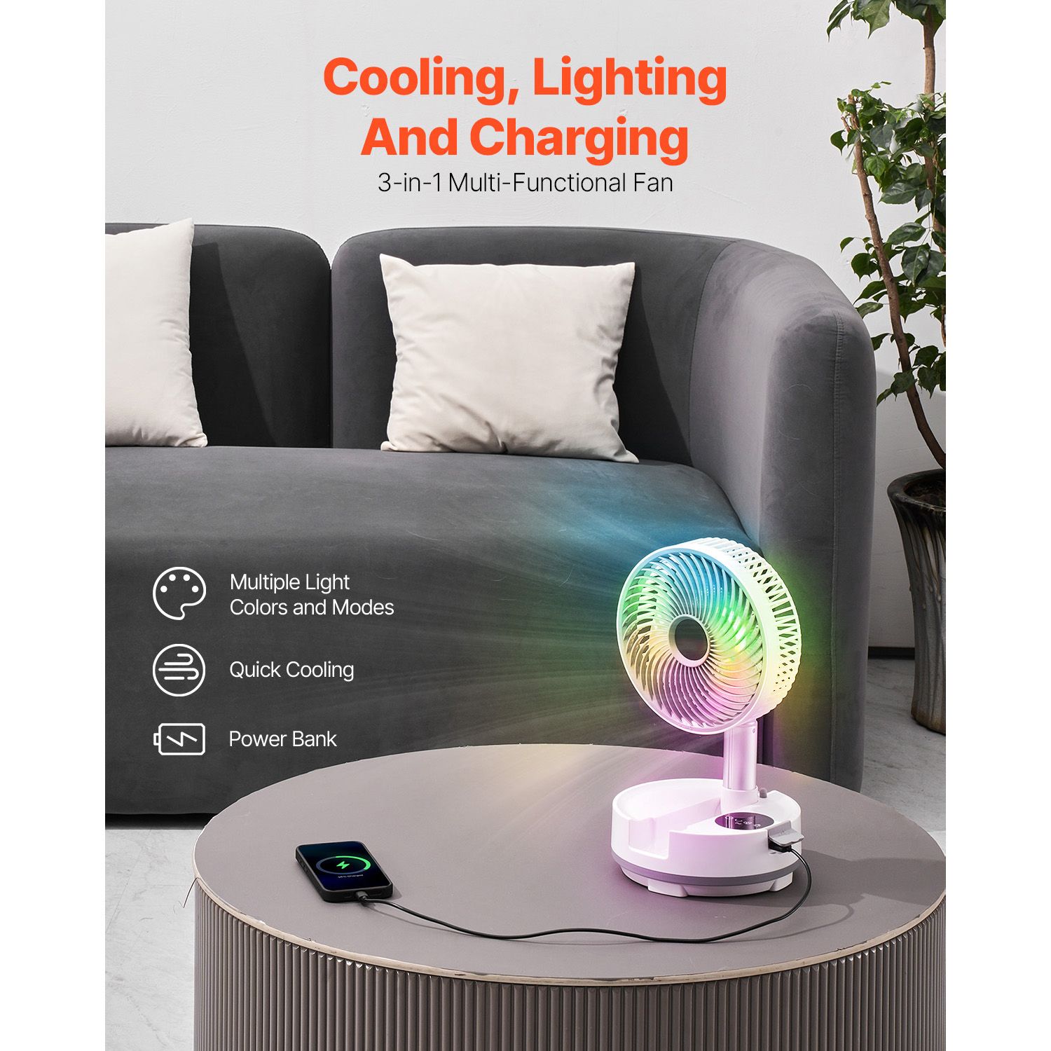 2.Long-Lasting Battery: Powered by a 20,000mAh large-capacity battery, the small fan can run for up to 112 hours on speed 1 when fully charged. The LED light on speed 1 lasts up to 200 hours. The convenient Type-C charging port ensures fast and efficient charging, offering strong compatibility for use at home or outdoors