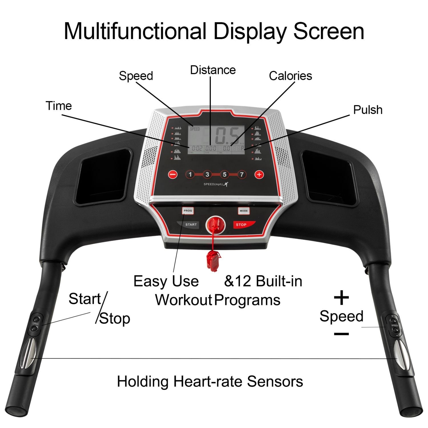 LED DISPLAY & HIGH QUALITY RUNNING AREA - ThIS compact treadmill has a clear LED screen that displays the running distance, running speed, running time, Calorie consumption, and heart rate in real time. A quick glance shows your current state of health. The running belt uses grass-like texture design, which brings anti-skid function and more comfortable running experience. The running area is 41.3"*17"