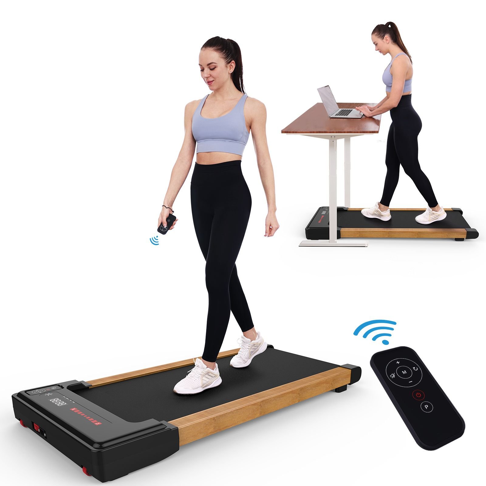 3.Ultra Light Design & Space Save: The OBENSKY mini treadmill for standing desk weighs 48 pounds and is 4.3 inches thick, whether you're in your office or apartment, you'll always find a right place to store it. Also the wheels on the front help you move and place it under sofa, corner or bed to save your home space. Max weight capacity: 265lbs.