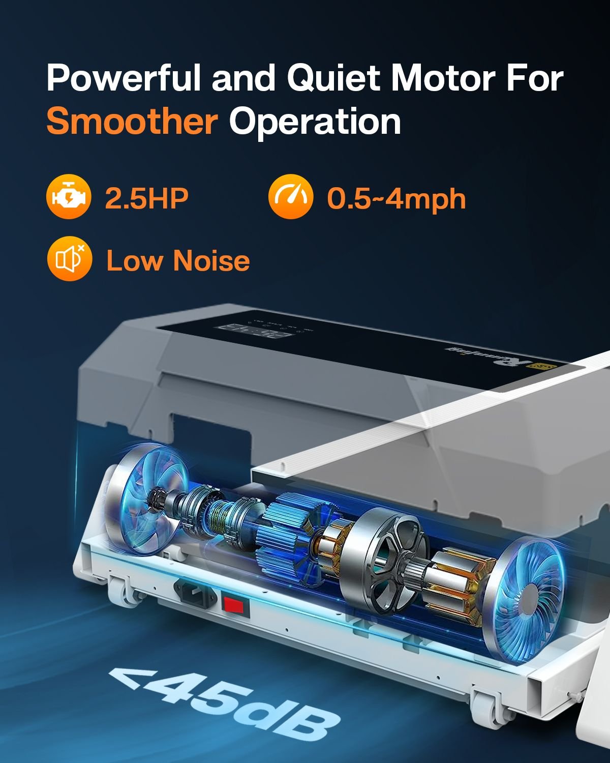 [2.5HP Powerful Quiet Motor & Shock Reduction System]This electric treadmill With a 2.5 HP powerful quiet Motor is perfect for running; jogging and walking in home or office. With a durable steel frame and multi-layer shield design; the under desk treadmill's shock absorbing and noise reducing; making your running quieter; safer and more comfortable.