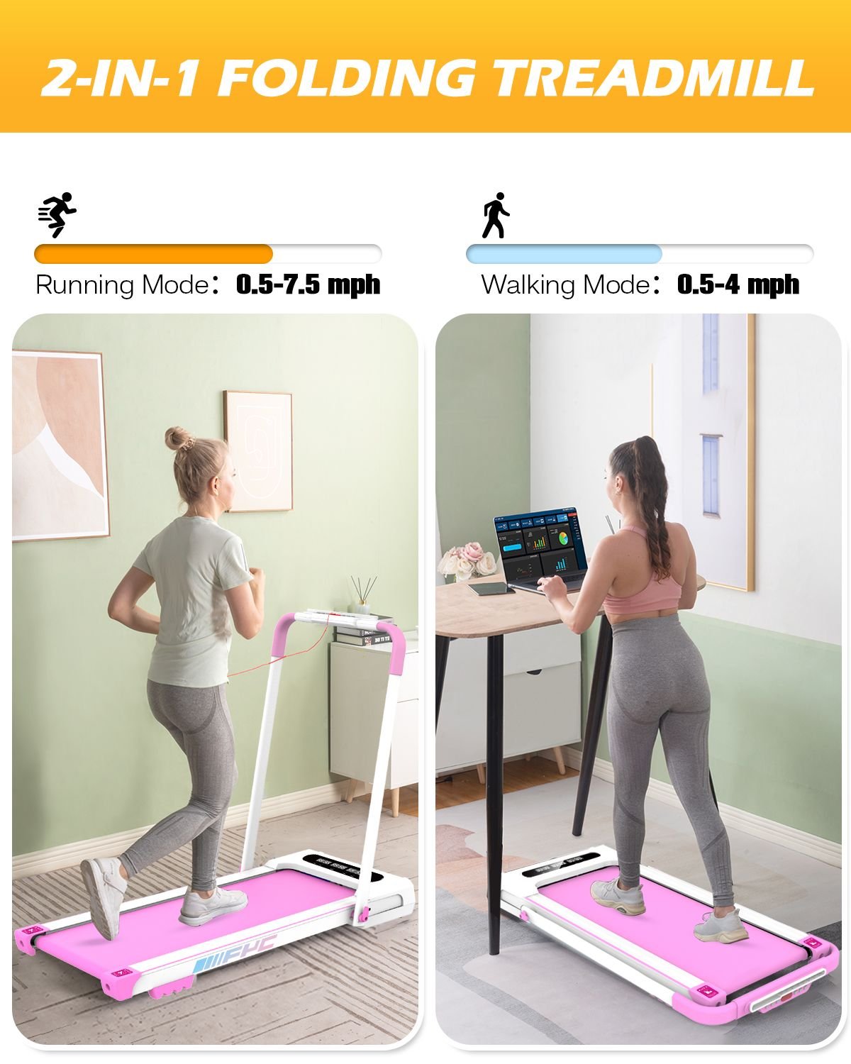 Compared to ordinary treadmills; this 2 in 1 folding treadmill for home has 2 exercise modes that can be used as running treadmill and under desk walking treadmill. When the handrail is folded; it can be used as under desk walking treadmill at a speed of 0.5-4MPH; so you can work or study while walking. When the handrail is raised; the running speed is 0.5-7.5MPH and you can run to reach your fitness goal.