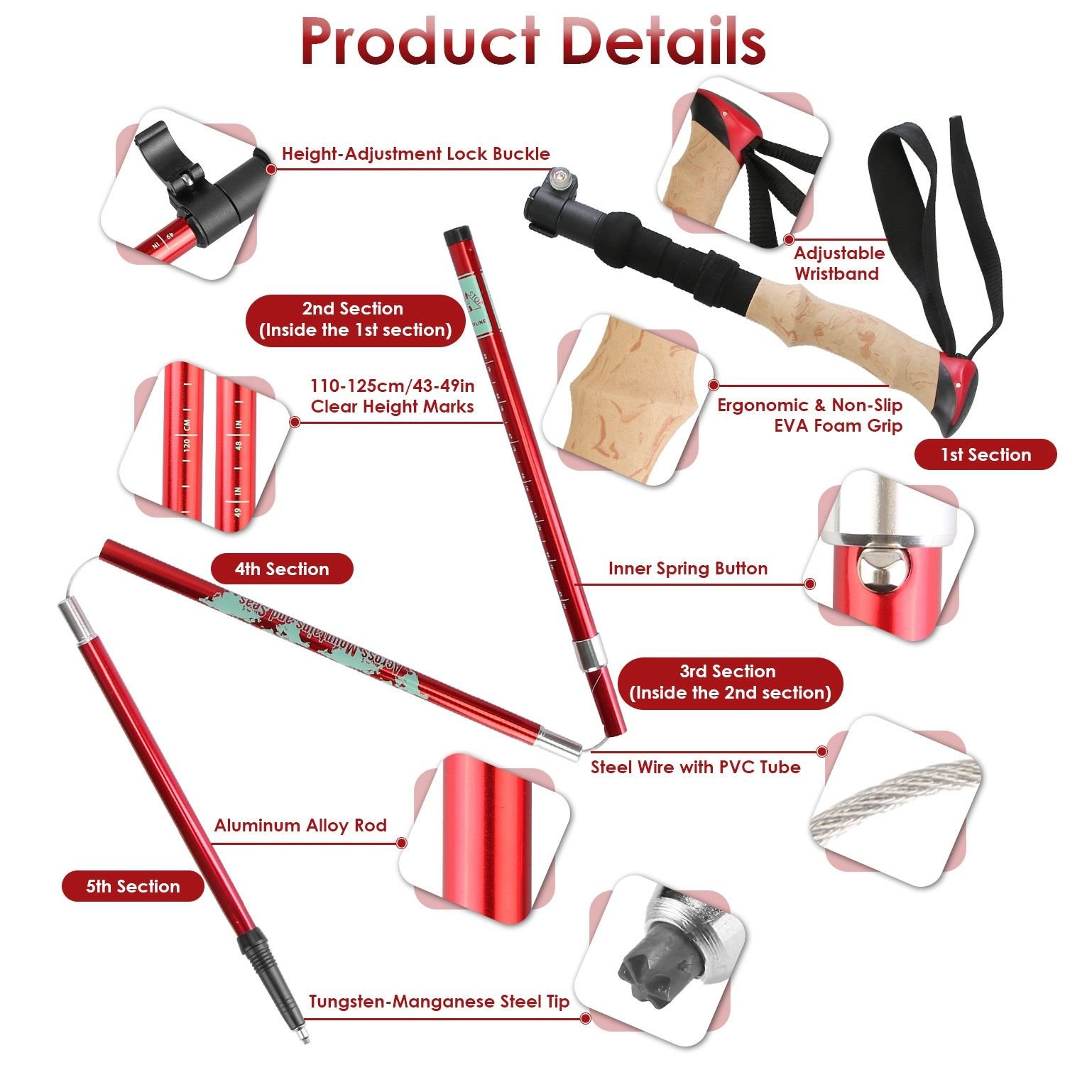 *Sturdy Trekking Poles*:The rod is made of aluminum alloy and the tip is made of tungsten-manganese steel,which make the stick robust and strong enough for unparalleled stability and support for your outdoor activities.