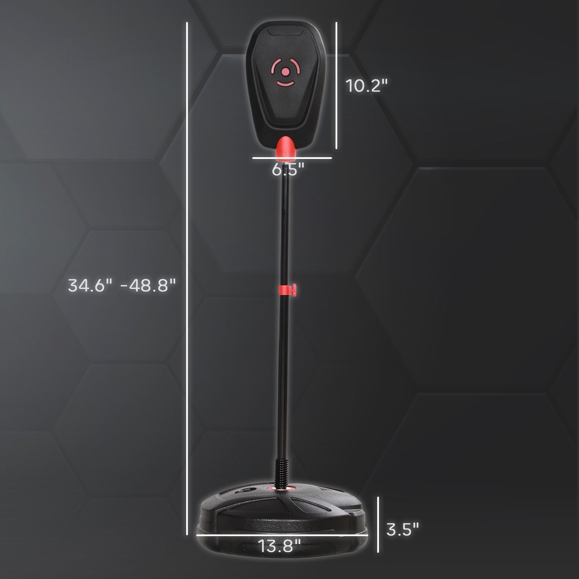 5.- Boxing Bag with Stand Info: Overall Dimensions: Dia. 13.4" x 34.6"-48.8" H. Base Load: 12 lbs. (Water), 20 lbs. (Sand). Standard: CPSIA, ASTM F963. Assembly required..