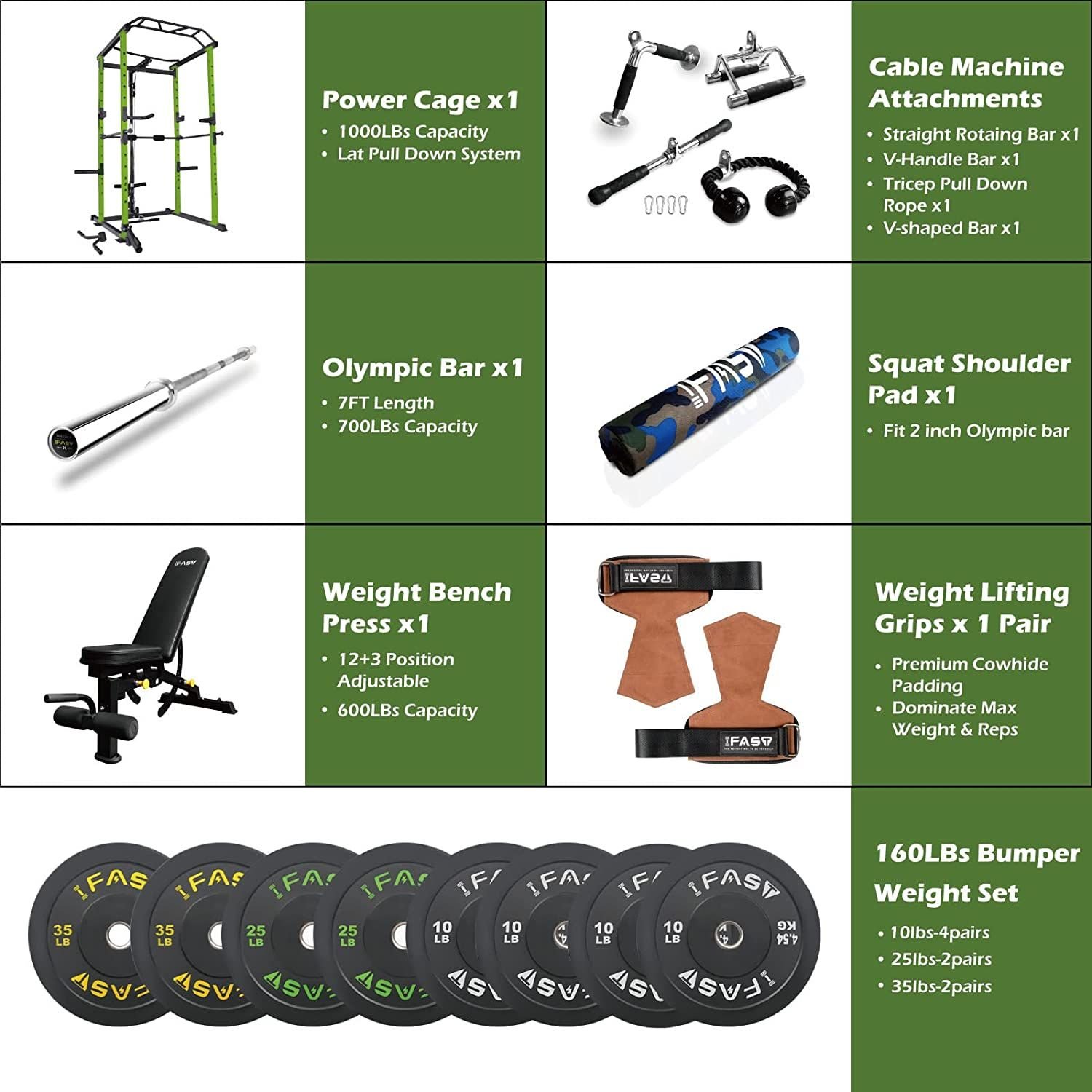 1.Package ListPower Cage with Lat Pull Down System x1; Adjustable Weight Bench x1; 7FT Olympic Barbell x1; 100LBS Olympic Rubber Plates Set (10lbs x2, 15lbs x2, 25lbs x2); Weight Lifting Hook x1 Pair; Squat Shoulder Pad x1; Straight Rotating Bar x1; V-Handle Bar x1; Tricep Pull Down Rope x1; V-Shaped Bar x1.