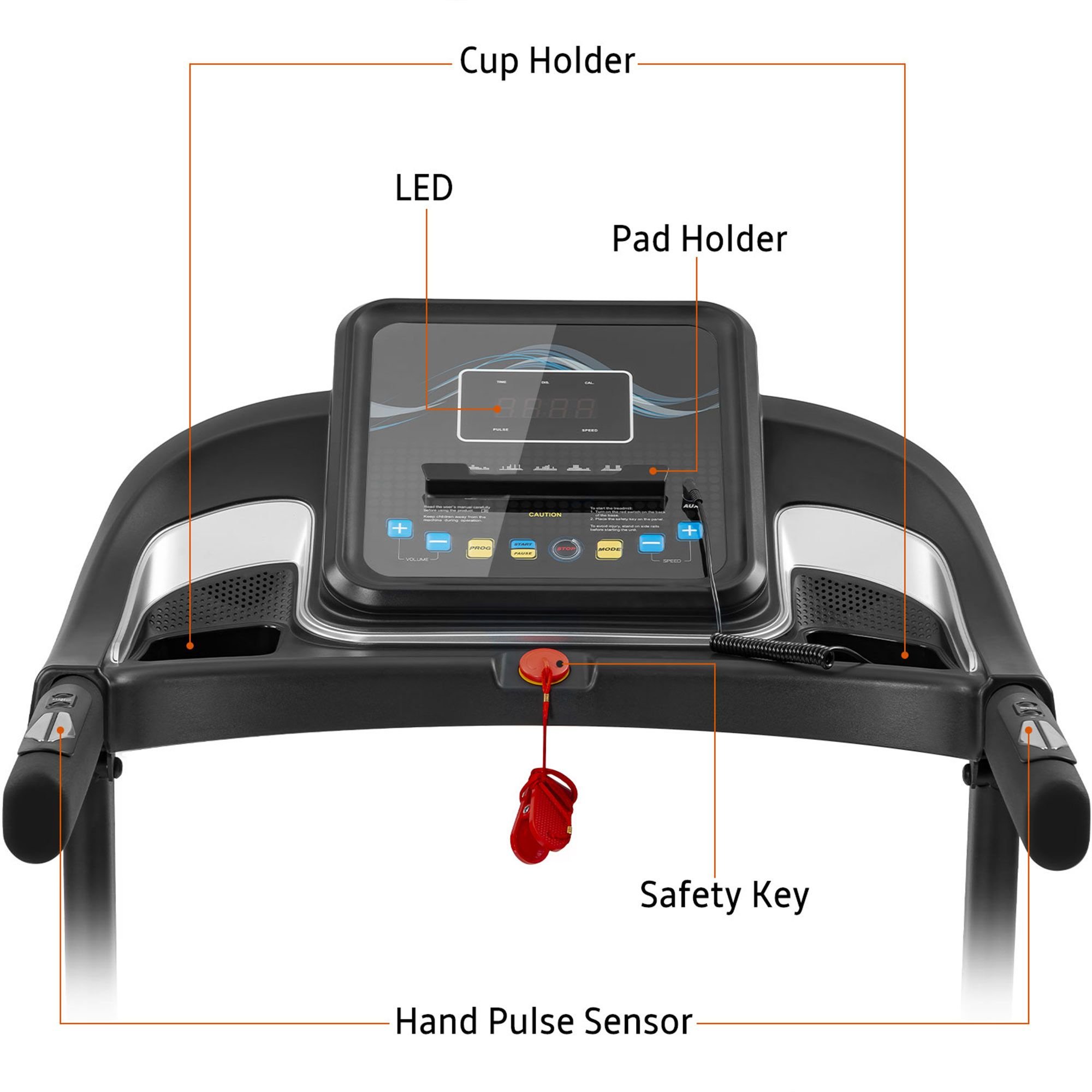Compact Easy Folding Treadmill Motorized Running Jogging Machine with Audio Speakers and Incline Adjuster· [0-7.5 MPH Speed Adjuster] Go from 0.8 – 12 KM/H (0.5 to 7.5MPH) within seconds using the speed adjuster allowing you to seamlessly transition from light warm-up to a run.· [Quality 4-Layer Running Belt] Features PVC diamond tread outer layer that resists wear 2 mesh layers and a PVC layer for shock absorption and a smooth comfortable run.· [Customize Your Workout] Large LCD display and hand pulse sensor help track your real-time progress in speed, distance, time, calories and heart rate. 3 adjustable incline options and 12 built-in workout programs help you exercise more efficiently. · Product Dimensions: 50.5' x 23.7' x 45'. Folded Size: 26.5' x 23.7' x 49'. Running Surface: 15.5' x 41.5'Bring the outdoors into the comfort of your own home with this compact treadmill, a great option to workout indoors and hold yourself accountable to meeting or maintaining workout goals. Complete with a compact design, this Treadmill has a small footprint that's perfect for apartments or at-home gyms that are low on space with its easy-storage folding mechanism, allowing users the option to quickly fold it up and out of the way to conserve valuable space in your home when needed. Sleek in design, this treadmill is built with high-grade sourced materials to closely mirror the average treadmill you see at your local gym, without the hefty price tag. Kick your cardio into high gear with the 12 built in running programs and 3 incline options that will help keep your workout interesting, and a robust 1.5HP motor capable of taking your treadmill from 0.8 – 12 KM/H (0.5 to 7.5MPH) in seconds to accommodate light warmups and brisk running. SPECIFICATIONSColorBlackMaterialFrame: SteelPanel: PlasticSpeed0.5-7.5 mphMotor1.5 HPTraining Programs12 ProgramsFoldableYesPhone/Pad HolderYesMultimediaAudio auxiliary port with dual speakersTransportation RollersYesIncline3-Level Manual InclineDisplayTime, speed, distance, calories, pulse rateHeart Rate PulseHeart rate sensors on handrailsRunning Area/Tread Belt41.5" x 15.5"Assembled Size (L x W x H)50.5" x 23.7" x 45" Folded Size (L x W x H)26.5" x 23.7" x 49"Max. User Weight240 LBSProduct Weight73 LBSPackage Dimensions55" x 27" x 10"Package Weight86 LBSWarranty1-Year Limited WarrantyPower Supply110VAssemblyAssembly requiredToolsTools required during assembly are included in package