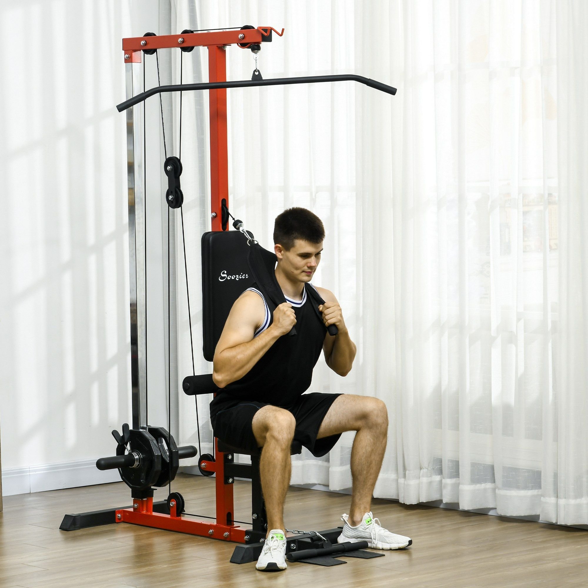 Home > Soozier Lat Pull Down Machine, High / Low Pulley Machine with Adjustable Seat and Flip-Up Footplate, Red