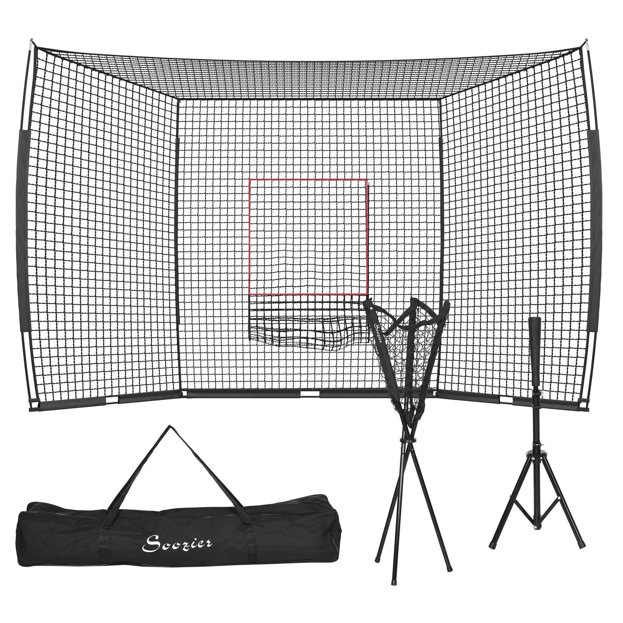 With an extra-large, forgiving size and the accessories you need, Soozier's batting net is ready for softball or baseball. Our baseball batting net set includes an adjustable height tee and a caddy that holds up to 120 baseballs. Each piece tucks neatly in the travel bag, letting you take it to softball practice at school, a friend's backyard, or get some practice in at the park. Made with materials that stand up to high-impact hitting and pitching, you can score big with a Soozier batting net.