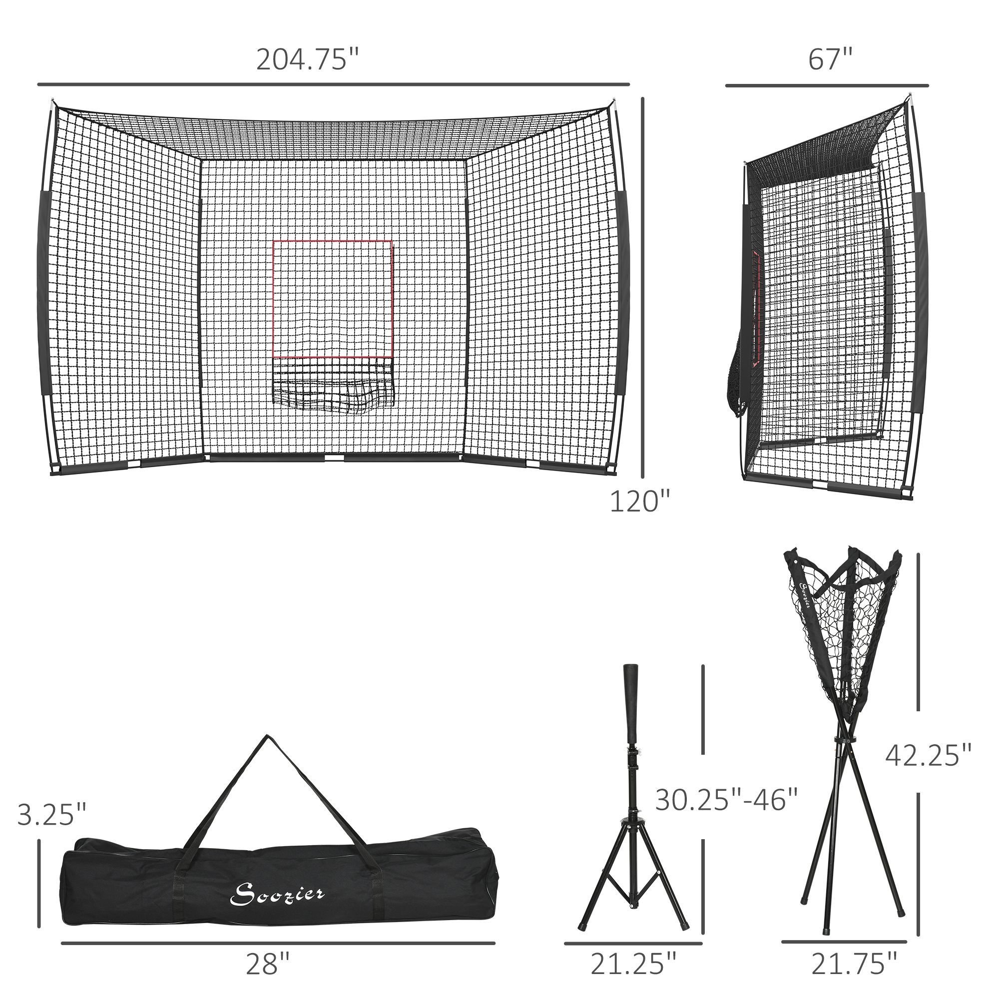 5.- Baseball Practice Net Set Info: Net Dimensions: 204.75" W x 67" D x 120" H. Caddy Dimensions: 21.75" W x 21.75" D x 42.25" H. Tee Dimensions: 21.25" W x 21.25" D x 30.25" - 46" H.