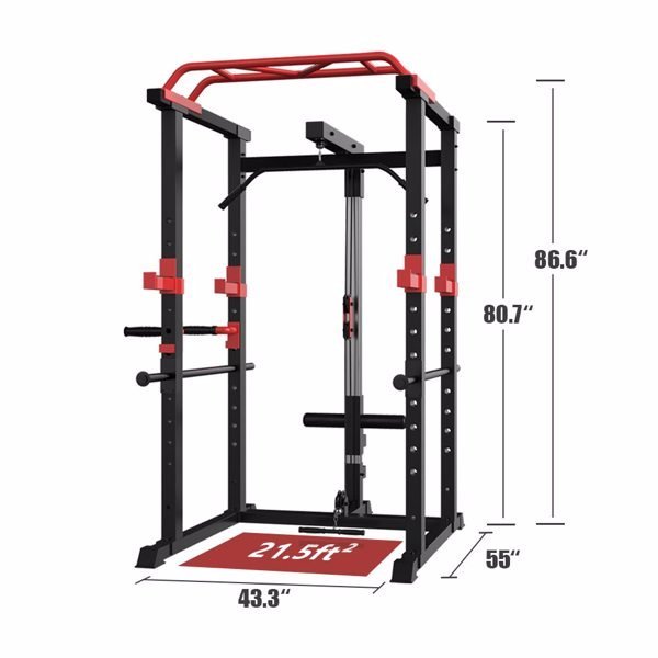 [1000lb Weight Capacity]Constructed with high-quality steel, the multi function power rack has a 1000lb weight capacity. The 2'' X 2'' frame with 12 adjustable height levels with Lat Pull-down Attachment is a functional piece of equipment that decreases the risk of injury when lifting solo and at higher weights.