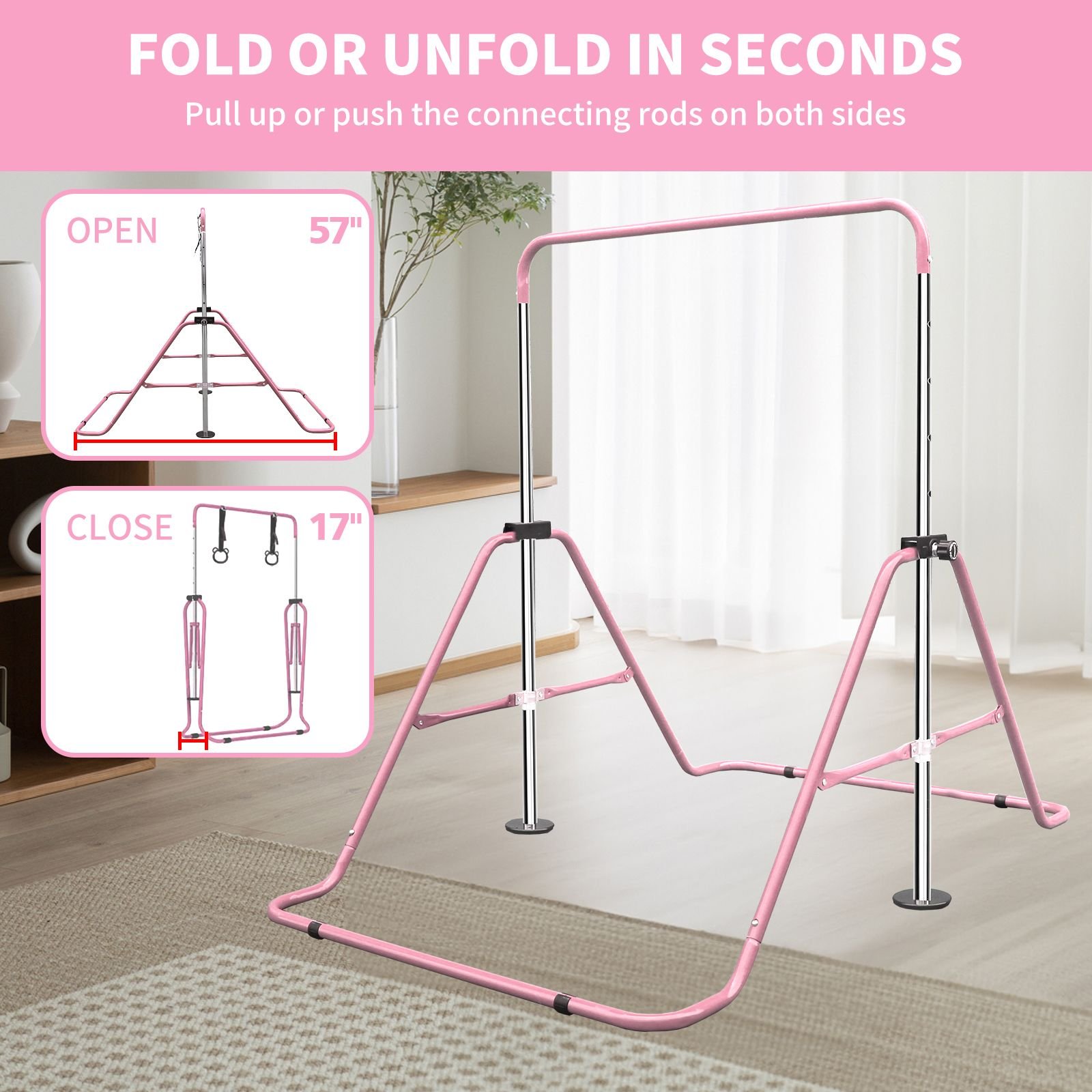 [FOLDING GYMNASTICS BAR FOR HOME] This gymnastics bar is designed to be portable and retractable. It is very easy to fold and carry, kids can enjoy gymnastics training anytime and anywhere.